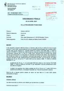 Kheir Allab, who has a French passport and lives in France, Switzerland and Algeria, has taken out successful cases against Hichem Aboud, the operator of YouTube channels Hichem Aboud and Amel TV. He claims that 12 videos, published between March and September 2020, are defamatory of him.