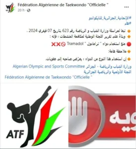 وكشفت الاتحادية الجزائرية للتايكواندو. بأنه وتبعا: “لمراسلة وزارة الشباب والرياضة رقم 623 بتاريخ 07 فيفري 2024، وبناءً على تقرير اللجنة الوطنية لمكافحة المنشطات، فإنه تم منع استخدام دواء ترامادول”.